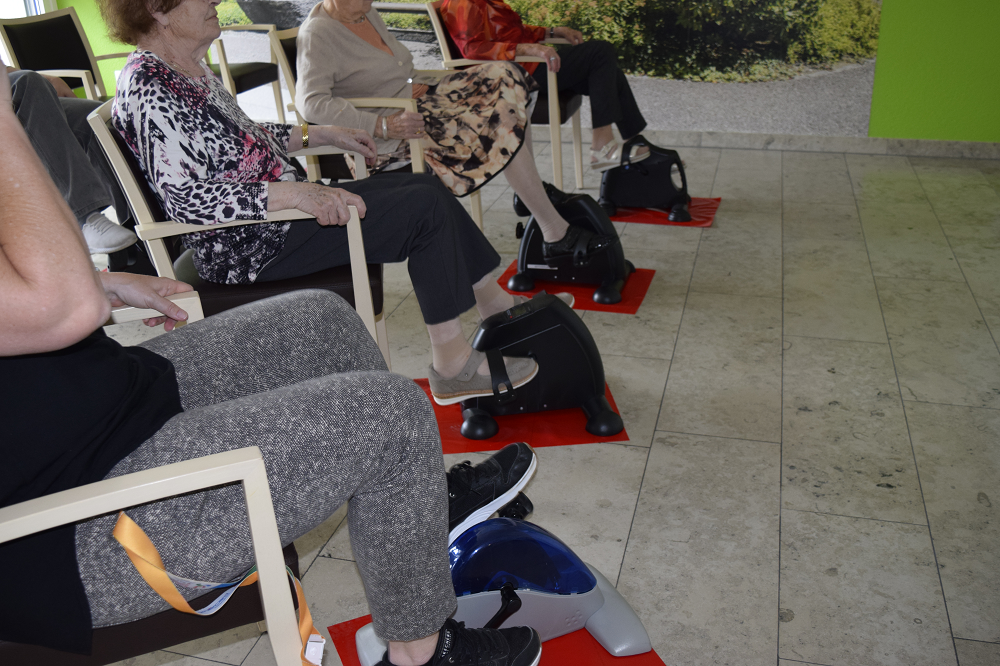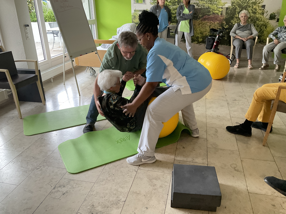 In der Woche vom 15.-19.4.2024 hatten wir eine Premiere: Erstmals boten wir von Montag bis Freitag täglich unterschiedliche Aktivitäten zur Sturzprävention für Bewohnerinnen, Bewohner und Mitarbeitende an. Am Montag starteten wir unter der Leitung des Aktivierungsteams mit einem Velotraining auf Sitzvelos. Das Training wurde mit Musik und Filmaufnahmen eines Velotrails in Spanien aufgelockert. Der Tanznachmittag am Dienstag mit John Scott stiess ebenfalls auf reges Interesse. Am Mittwoch stand "Aufstehen leichtgemacht" im Mittelpunkt, begleitet vom Kinästhetik-Trainer Lutz Zierbeck, der Bewohnerinnen und Bewohner gemeinsam mit den Mitarbeitenden der Pflege über die Möglichkeiten des Aufstehens nach einem Sturz aufklärte und trainierte. Zur Stärkung der Beinmuskulatur lernten die Bewohnerinnen und Bewohner am Donnerstag unter der Leitung von Susi Pierer verschiedene Trainingsmöglichkeiten kennen. Den Abschluss gestaltete am Freitag Daniela Vollenweider mit einem Rollator-Lauftraining, das verschiedene Herausforderungen bot, wie einem Strich entlang zu laufen oder einen Slalomparcours zu bewältigen.