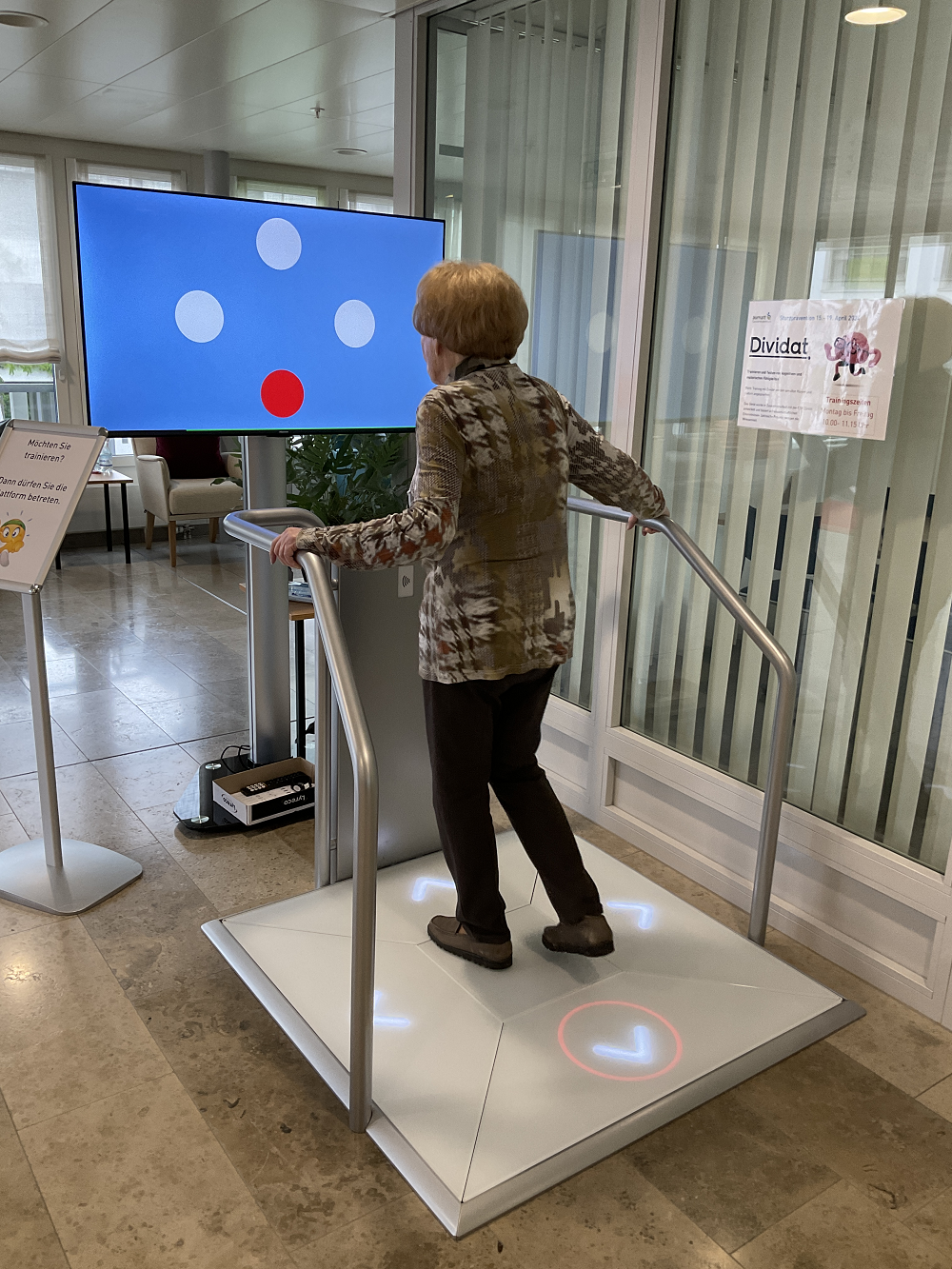 Um fit zu bleiben, reicht es aber nicht aus, nur den Körper zu trainieren, sondern es bedarf auch einer Verbindung zwischen Kognition und Motorik. Die Firma Dividat bot uns die Möglichkeit, ein Dividat Senso Trainingsgerät für diese Woche auszuleihen. Das Gerät wurde in Zusammenarbeit mit der ETH Zürich entwickelt und basiert auf wissenschaftlichen Erkenntnissen. Es umfasst verschiedene Trainingsprogramme, die gezielt Denkaufgaben mit Bewegung interaktiv verbinden. Sogar die Mitarbeitenden hatten ihre Herausforderungen mit einzelnen Trainings.